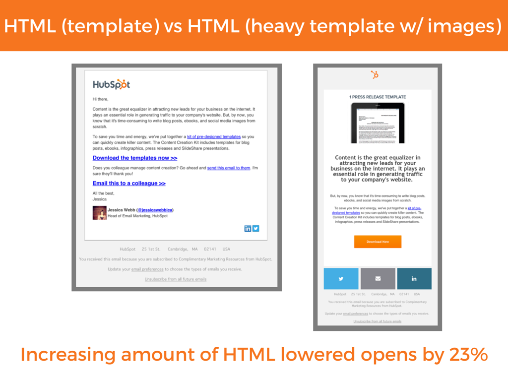 In one other test, they compared an email with minimal HTML formatting to a heavily formatted template containing images and call to actions. There was a drop with the more complex email. HubSpot reasoned that the change has to do with deliverability, so they went on to do one more test.